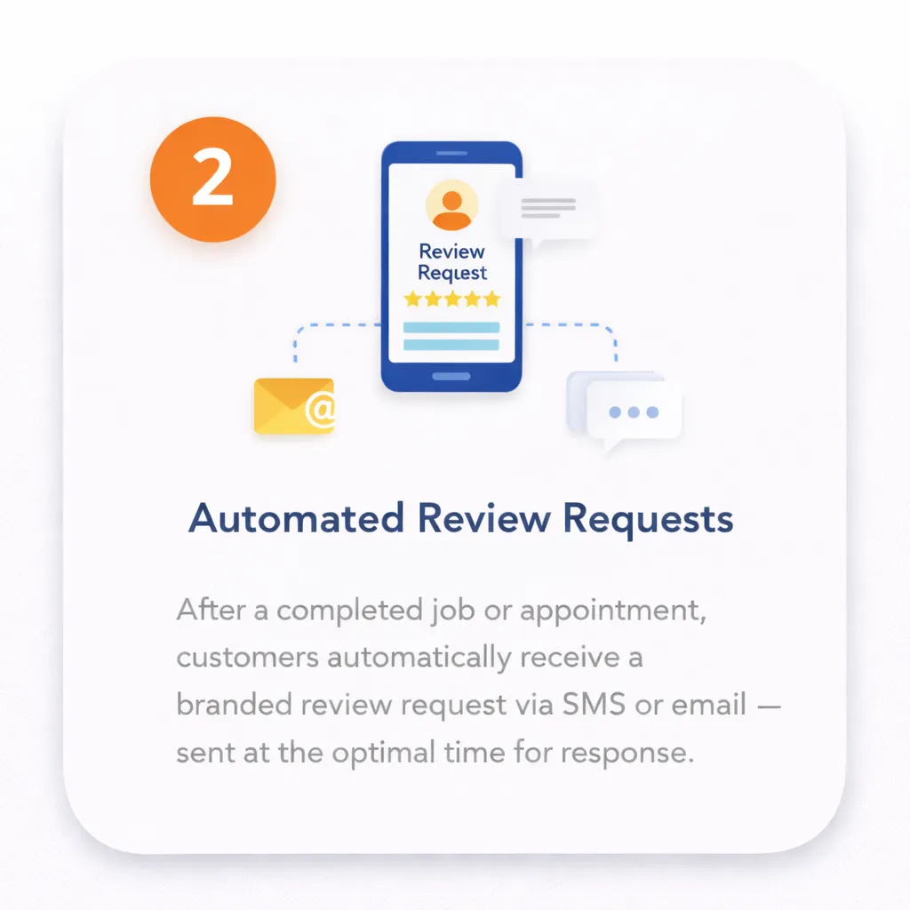 After a completed job or appointment, customers automatically receive a professional, branded review request via SMS or email sent at the optimal time for response.